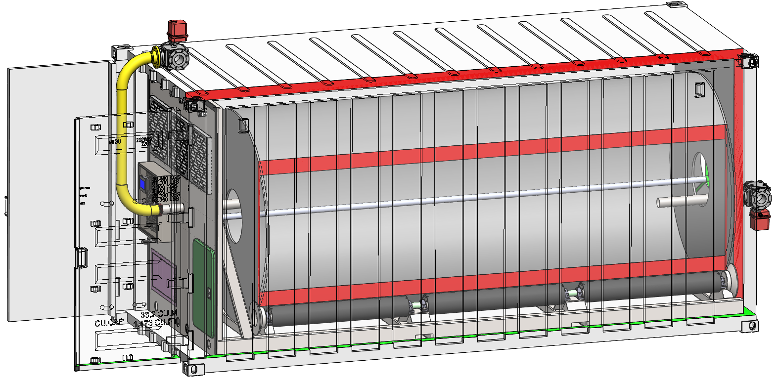 Note that these containers run unattended for months at a time, are self-cleaning, there is no waste water, about 1200 kg of sanitary steam is needed every 24 hours and is recycled, and about 5 kW of power is needed to rotate the drum at 10 rpm and run the fan at 4000 m3/h. Communication is by WiFi to a central maintenance station.
