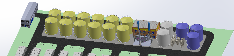 Water tanks (blue) feed a water main along the road next to the silos and branch off to each train of 50 containers. Similarly, enzyme solutions, urea solutions, and yeast nutrition solutions are distributed by a main and branches. Steam is generated next to the hammer mill and is similarly distributed - a main line along the road and branches to each container. Power is similarly distributed to the containers. Each container uses a 3-way ball valve to pump liquids from each branch.